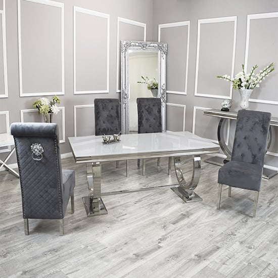 Furniture in Fashion brings you the exquisite Alto White Glass Dining Table With 8 Elmira Dark Grey Chairs, an exceptional piece that will elevate your dining room decor. Made with premium quality tempered glass, this dining table boasts a White glass top that will add charm and personality to your space. The polished base not only complements the glass top but also provides the necessary stability for daily use. With its large size, the Alto dining table provides ample room for your family and guests to enjoy meals together. This stylish and durable dining table is the perfect combination of function and beauty, making it a must-have addition to any modern dining room. Trust Furniture in Fashion to bring you quality craftsmanship and stunning design in the Alto White Glass Dining Table With 8 Elmira Dark Grey Chairs. FEATURES : Table Material : Glass, Stainless Steel Table Finish : White, Polished Stainless Steel Chair Material : Velvet, Steel Chair Finish : Dark Grey, Chrome Set Includes : 1 Dining Table, 8 Dining Chairs Stylish grandeur providing an instant focal point to your room Beautiful White glass top With a striking polished stainless steel base Glass tops are incredibly hardwearing and scratch resistant Available at an affordable price Images shown are for illustration purpose only DINING TABLE DIMENSIONS (2. 0-ARNADT-WG) : Height : 77cm Width : 200cm Depth : 100cm DINING CHAIR DIMENSIONS (1-DC-8053-QL-DG-V) : Height : 107cm Width : 46cm Depth : 55cm